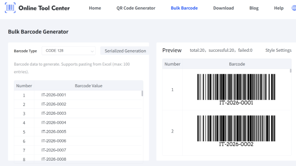 Δημιουργήστε πολλαπλούς γραμμικούς κωδικούς σε μαζική κλίμακα από το Excel ή το CSV. Δωρεάν online γεννήτρια πολλαπλών γραμμικών κωδικών που υποστηρίζει κωδικό 128, EAN-13, UPC-A και μορφές εξαγωγής έτοιμες για εκτύπωση.